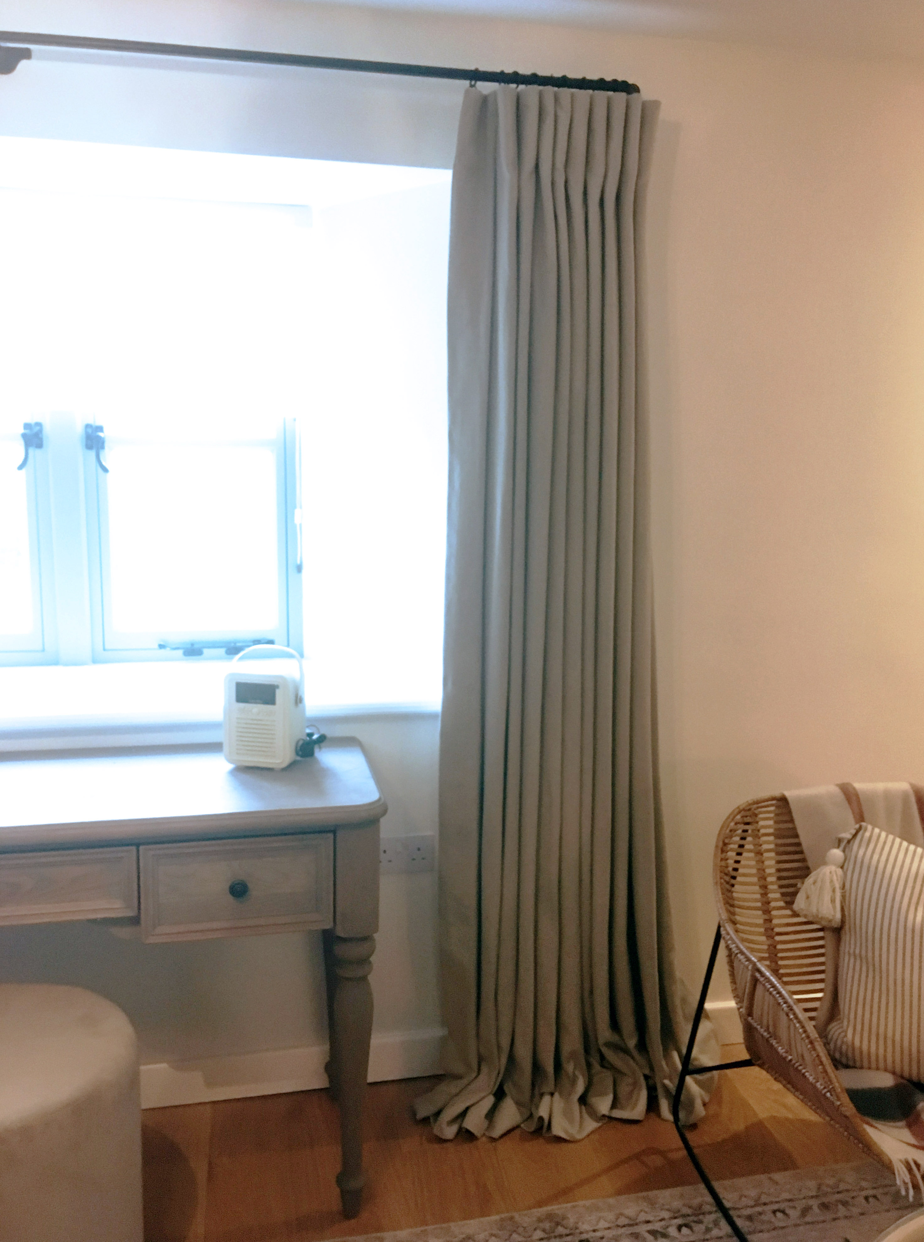 Inverted pleat linen curtains on 19mm diameter black French pole, with sheer linen roman blind. Cotswold Barn conversion near Cheltenham. Inverted pleat linen curtains on 19mm diameter black French pole. Cotswold Barn conversion near Cheltenham.